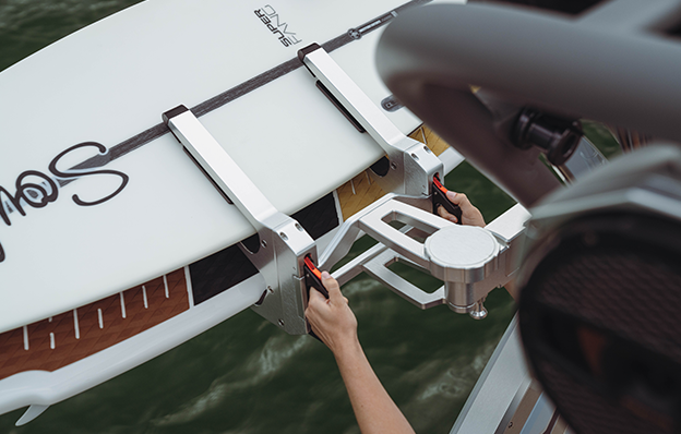 Say goodbye to bungees as MasterCraft’s Essential clamping board racks are now standard on every tower with an option to upgrade to Supreme clamping board racks to accommodate thicker boards.