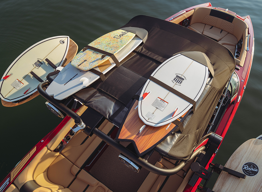 New for 2023, MasterCraft has the most board storage in the industry. Thanks to standard clamping board racks and redesigned biminis with surf sleeves, all models can hold up to 10 boards. MasterCraft is the only brand to offer bow, aft, and side shade options in addition to our seamlessly integrated and easy-to-use biminis, which can hold up to six boards.